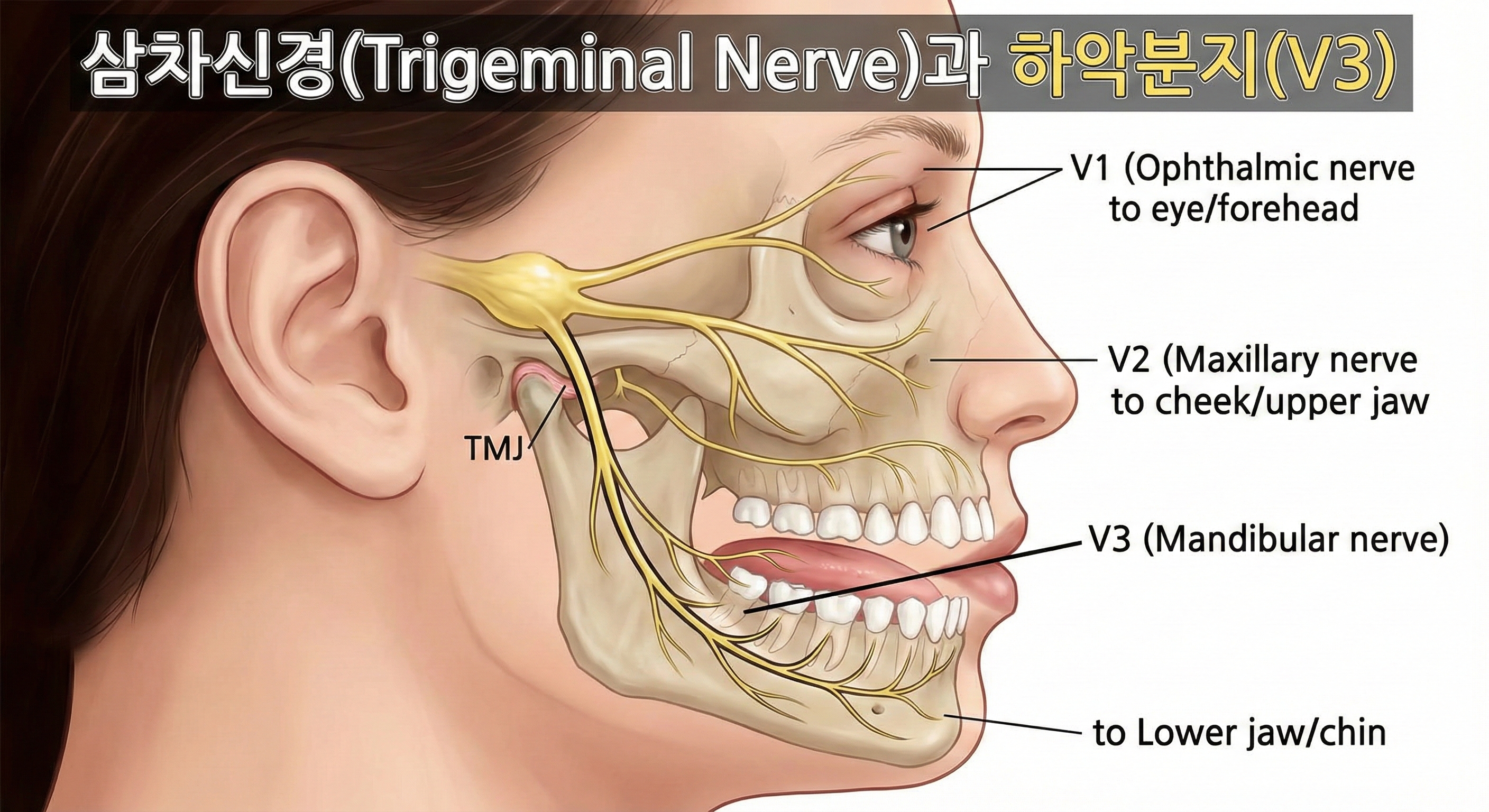 우리가 주목해야 할 부분은 바로 이 세 번째 가지, V3(하악분지)입니다. 턱관절의 움직임, 감각, 통증 모두 이 신경이 관여하거든요.